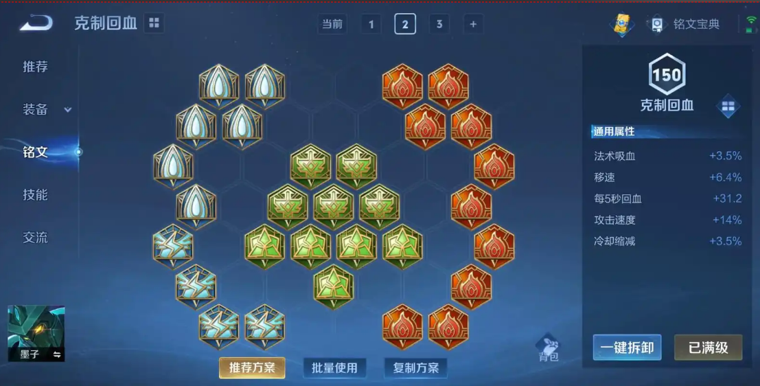 辅助装一般先出学识宝石,然后根据团队需要升级成极影或者救赎之翼,极影能帮队友加攻速和减冷却,救赎之翼则能给队友套个护盾。鞋子方面,如果对面控制多,抵抗之靴是更好的选择。核心装备里,圣杯几乎是必出的,因为它完美解决了墨子蓝耗高的问题,还能提供冷却缩减,让你可以肆无忌惮地丢技能。之后就要补肉装了,时之预言是个不错的选择,它能根据你的法强提供双抗,越打越肉;极寒风暴提供海量的物理防御和冷却缩减,被动还能减速敌人;魔女斗篷则是应对敌方法师爆发的利器。这样出装的墨子,虽然输出不高,但非常能抗,控制链又足,能让对手非常难受。铭文也要换成坦克向的,比如10个宿命、10个调和和10个虚空。