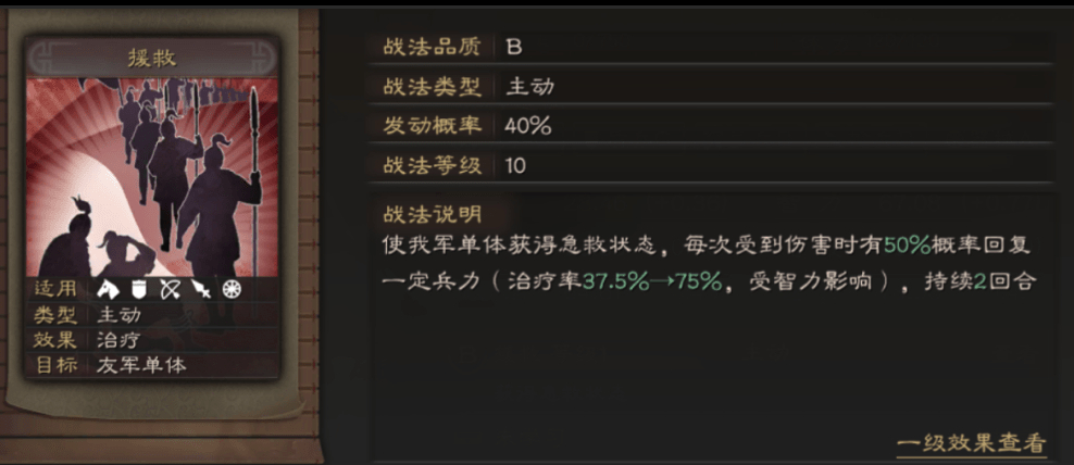 相比之下,援救则是一个主动战法,它的发动概率比较高,有40%,一旦触发就能为我军单体恢复兵力,并且这个恢复效果持续两回合。援救的治疗效果会受到武将智力属性的加成,这意味着如果你的武将智力高,触发一次援救可能恢复的兵力总量会非常可观,甚至超过自愈一回合的恢复量。但它的缺点也很明显,那就是看脸,属于概率触发,如果脸黑连续几回合不发动,那就一点治疗都没有,稳定性不如自愈。对于追求稳定开荒、不想赌运气的玩家来说,这点需要仔细权衡。
