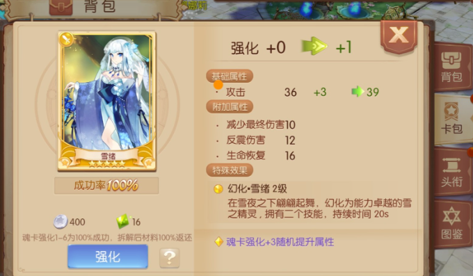 魂卡系统对攻击的影响特别大,相当于给装备额外插槽镶嵌属性卡。武器卡能让咱们变身萌宠使用强力技能,手套卡、防具卡直接加攻击数值,护符卡和头饰卡也有属性增益。有洞就镶卡,蓝卡紫卡都行,前期别强求金色。镶好后优先统一强化到+6,稳定提升战力。高级魂卡像加最终伤害、暴击率的要重点培养。