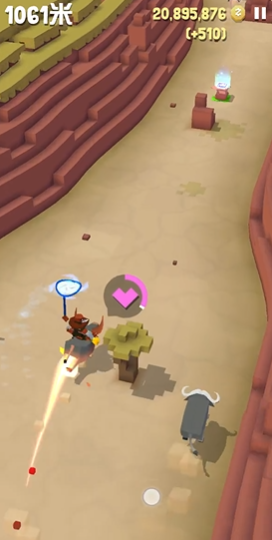看到牛之后你得眼疾手快地拿起地图里的火把,朝它扔过去。这一下必须扔准,扔早了或者扔晚了都不行,牛一出现就得动手。火把砸中后,牛会被激怒,变成浑身冒火的火崩牛。这时候你就要稳稳地骑在它背上,千万不能撞到障碍物摔下来。
