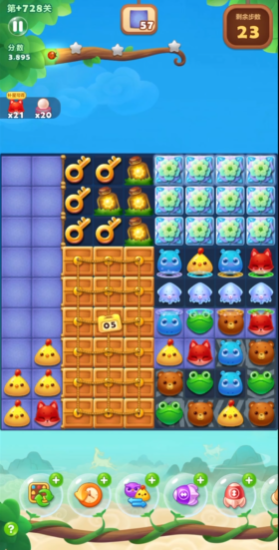 要着力合成魔力鸟,并尝试将魔力鸟与直线特效、爆炸特效等进行交换,可以引发大范围的消除,一次性清理掉成片的冰块。关卡中的独眼仔是宝贵的助力,它会自动生成直线特效来帮助你消除周边难以直接处理的冰块,尤其是棋盘右侧那些无法直接交换的顽固冰块,往往需要依靠独眼仔产生的特效来间接攻克。