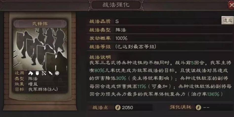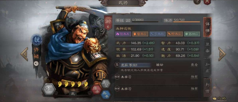 战法配置需围绕许褚的爆发与典韦的防护展开。许褚作为主输出,必带高发动率的单体兵刃战法,如轻勇飞燕(多段伤害)或暴敛四方(高额单体),配合骑虎难下补充群体伤害;典韦需全统率加点,优先携带锋矢阵强化许褚30%伤害并分担部分伤害,另一战法可选魅惑(受击时控制)或气凌三军(反击增伤)。辅助位推荐曹操,战法选择陷阵营(统率提升+急救)和暂避其锋(谋略减伤),避免许褚被法师秒杀。