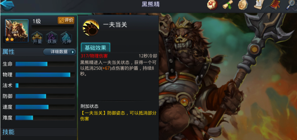他的主要控制技能趁火打劫能对扇形范围内的敌人造成伤害并施加嘲讽效果,强制对手攻击自己,从而有效保护后排队友。而黑旋风是一个强大的群体控制技能,黑熊精会挥舞长枪旋转,击退并伤害接触到的敌人,同时旋转过程中处于霸体状态,可以强行冲散敌方阵型。他的被动技能一夫当关则能提供一个可抵消伤害的护盾,进一步提升生存能力。理解这些技能机制,是进行有效天赋加成的基石。