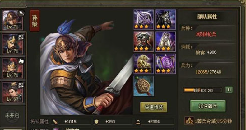 当玩家等级突破60级,孙策、甘宁和吕蒙相继进入视野。孙策在62级左右招募,特色为山地防守,属性较为均衡,在游戏中后期大量山地地形的副本中不可或缺。甘宁在66级后招募,以其极高的勇武值著称,战法固守可打四排且距离己方都城越近伤害越高,拥有出色的战法抵挡能力,在防御和特定输出场合表现抢眼。吕蒙则是68级出现的攻城利器,拥有城池突击和城池攻击两项特色战术,在城池地形战斗中有高达30%的伤害加成,是完成占领城池类任务的绝佳选择。