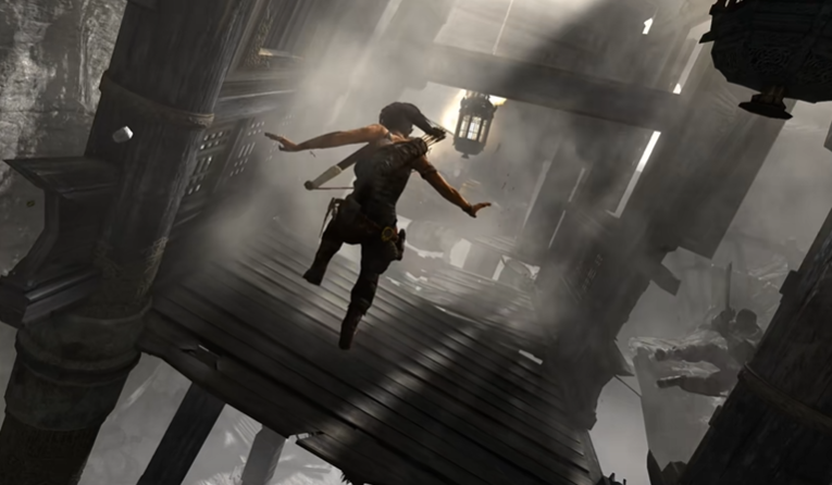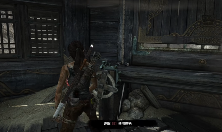 当关键的钟摆谜题解决,大钟坠落砸穿地面后,你通常会随之掉落到寺庙的更下层。此时寺庙结构开始变得不稳定。迅速爬起来,向前方的栈道奔跑逃离。沿着栈道走到尽头,你需要跳向空中悬挂的吊桥,然后沿着山体斜面滑行。在滑行过程中,注意使用枪械打穿前方阻挡道路的木栅栏。
