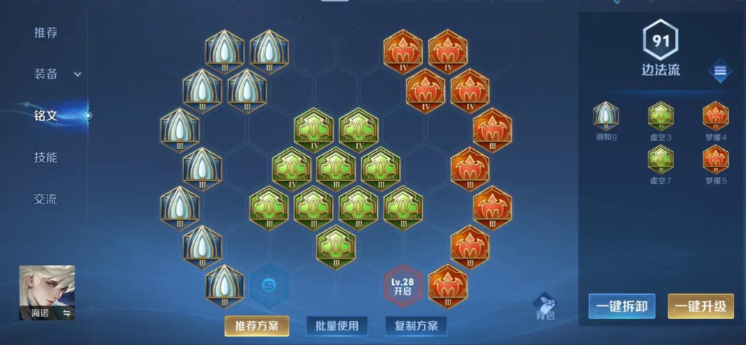 第二套备受推崇的铭文方案是梦魔+轮回+献祭。这套铭文的侧重点有所不同,它更偏向于强化技能伤害的输出频率与前期压制力。梦魔铭文主要提升法术强度与穿透,最大化技能的爆发伤害;轮回铭文则提供了额外的冷却缩减与少量的法术吸血;而献祭铭文同样贡献了宝贵的冷却缩减属性。这套搭配的核心优势在于技能刷新速度,它让海诺在游戏开局就拥有更高的技能释放频率,能更流畅地打出连招和切换形态,通过频繁的技能施放来建立线上优势。