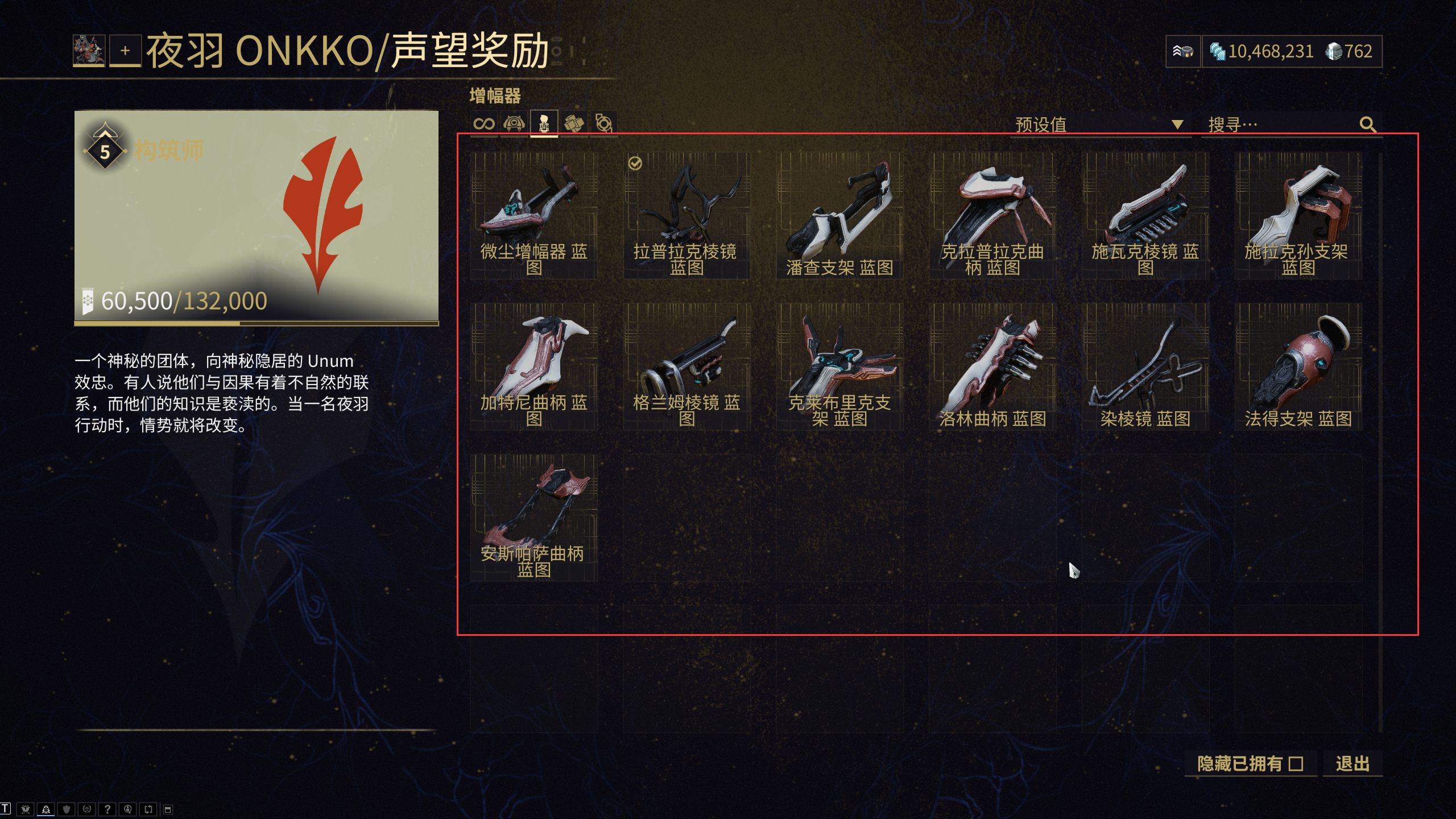 部件的进阶强化依赖夜羽集团声望与稀有材料,升级过程需在地球赛特斯的司书昂克处完成,包括兑换部件设计图、铸造组件、组装装备,并通过完成任务积累经验来提升增幅器等级,高效获取经验可参与圣殿突袭模式。