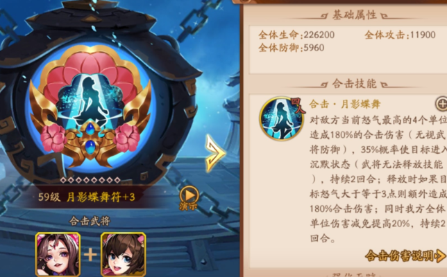 合击技能与兵符的选择对阵容有显著的战术加成,需要与阵容特性相匹配。吴国的合击技和兵符能有效强化灼烧、控制或生存效果,例如地刺狂熊是性价比较高的控场选择,火蛇舞兵符则能强化灼烧伤害。若缺乏特定兵符,也可选择月影蝶舞等通用型兵符提升生存能力。主角的幻化角色选择也需考虑对阵容的整体增益。这些系统性的搭配能进一步提升阵容的上限和实战中的应对能力。