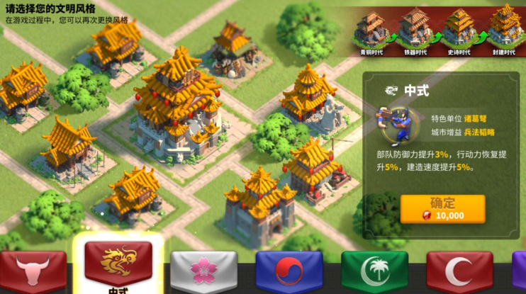 文明风格的选定是另一项塑造发展路径的根本性决策,不同的文明提供独特的属性加成与特色兵种。对于绝大多数新手玩家而言,中国文明是极为友好的首选,其提供的建筑加速加成能让你更快地升级市政厅等关键建筑,抢占前期发育的时间优势。如果你更崇尚进攻,德国文明提供的骑兵攻击力提升与训练加速则能让你组建起强大的突击力量。而偏好稳健科技发展的玩家,可以选择韩国文明来获得研究速度的加成。需文明风格在游戏后期可以免费更换一次,因此开局选择应侧重于如何最有效地度过前期瓶颈,为转型积累资本。