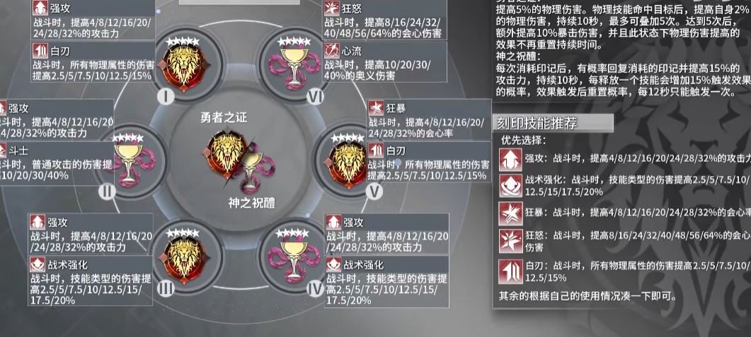 刻印选择上,在角色突破到Ω之前,建议使用皎月的眷恋和神之祝酒这两套刻印组合,它们能提升印记回复效率,让真红更频繁地使用强化后的绯·散华;突破到Ω后,可以加入勇者之证套,形成勇者之证、皎月的眷恋和神之祝酒的2+2+2组合,其中勇者之证刻印最好放在1号和5号位,以增加暴击和物理伤害,其他位置随意摆放来凑套装效果,刻印的副词条优先选择攻击、暴击和物理伤害属性。