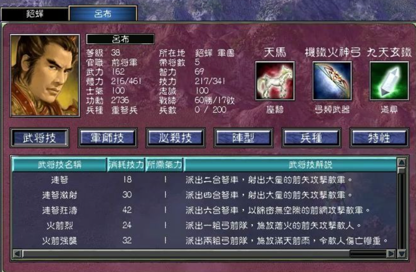 综合能力被视为最强的武将是吕布。他被普遍认为是游戏战斗力的标杆,尤其在单挑和千人战中表现极为突出。这一评价源于他顶级的初始武力值、强悍的专属必杀技以及优秀的初始特性组合。他的专有必杀技弑鬼神是枪系的大范围攻击,在清兵和打将方面效率很高。其初始特性通常包含骁勇、斗志、飞马等,这些特性直接提升了攻击速度、必杀技释放概率和移动能力,构成了他作为顶级猛将的基础。后期通过合适的官职和装备搭配,能进一步放大他的优势,使其在战场上几乎所向披靡。