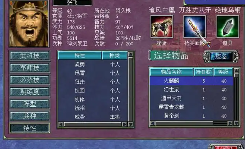 武将的强度并非单纯看武力值,特性、专有必杀技和技能组合才是决定其上限的关键。骁勇大幅增加必杀技发动率,斗志提升集气速度,飞马和迅雷增加移动和攻击速度,铁壁和刚体则增强防御能力。一个拥有骁勇、斗志、飞马、迅雷等强力特性组合的武将,其实际战斗力会远超仅有高武力的角色。专有必杀技的威力与范围也至关重要,像弑鬼神、黑风天煞、银龙逆鳞枪这类大范围高伤害的必杀技,是武将实现一骑当千的核心资本。