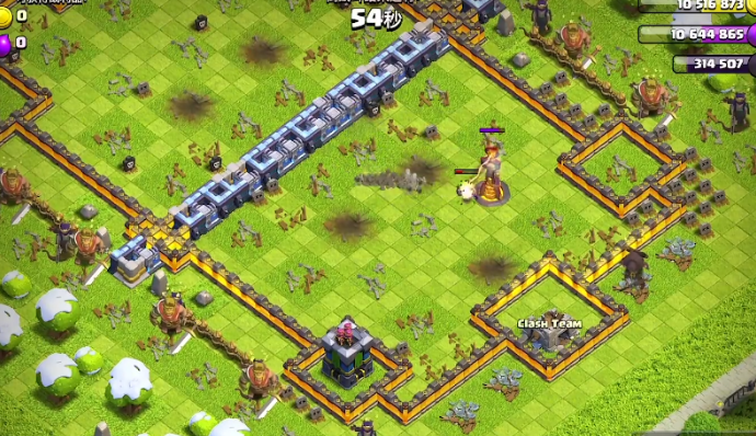 清理掉援军后,需要立即为主力部队开辟清晰的进攻走廊,防止其走偏。通常在阵型两点钟方向的角落释放弓箭女王并配上天使,同时可以加一个皮卡超人帮助清理该区域。他们的任务是摧毁侧翼的防御建筑,包括隐藏的电塔。在六点钟方向释放剩下的皮卡超人执行同样的清边任务,如果觉得攻击力不足,在后续部署主力时可以向该方向稍作倾斜。