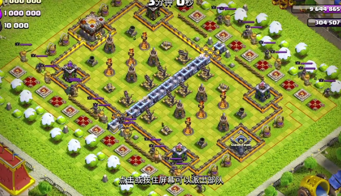 完成两侧清边后,中路的进攻便可展开。主力部队通常采用矿工和野猪骑士进行一字划式平铺,利用他们锁定防御建筑的特性,沿中路稳步向内推进。此时左右两路已提前清边,所以中路的兵种会沿着既定路线前推,不会乱跑。