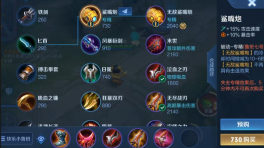 鞋子选择急速战靴,前期攻速加成对鲁班清线和消耗非常重要。第二件闪电匕首进一步提升攻速和暴击率,被动连锁闪电还能补充额外伤害。无尽战刃是核心暴击装,配合闪电匕首能让你的暴击伤害大幅提升。破晓提供物理穿透,对付坦克和战士特别有效,同时还能增加攻速和暴击率。