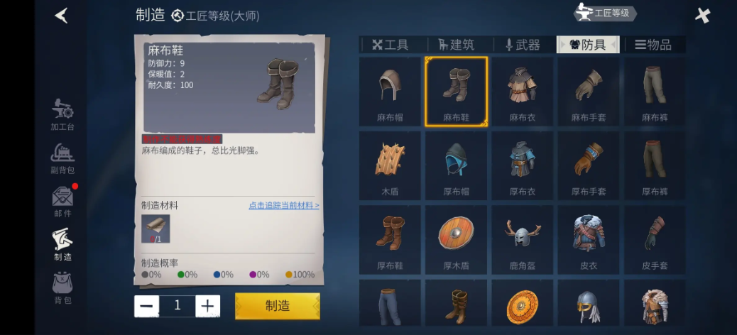 关于材料转化效率,厚布鞋被证实是较优选择,其制作消耗1棉花+1亚麻,拆除后可获得9个回收材料。相比之下,皮鞋需要额外消耗2张轻皮革,虽能产出15个回收材料,但综合成本较高。玩家需根据当前资源储备,合理规划建筑拆除与材料回收策略。