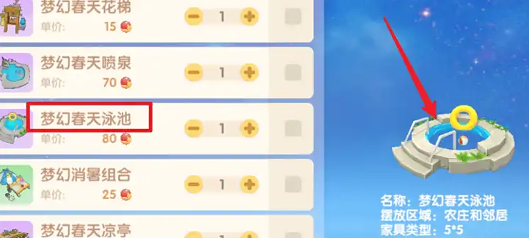 梦幻春天游泳池属于超拉专属家具,需开通超级拉姆特权后通过商城购买获取。该泳池为5×5规格的大型装饰,支持双人互动功能,是夏日社交场景的热门选择,售价80金豆,适用场景包括农场和邻居区域。购买路径为,游戏主界面左上角商城入口→家具栏切换至超拉专属→选择梦幻春天组合→找到泳池图标完成支付。