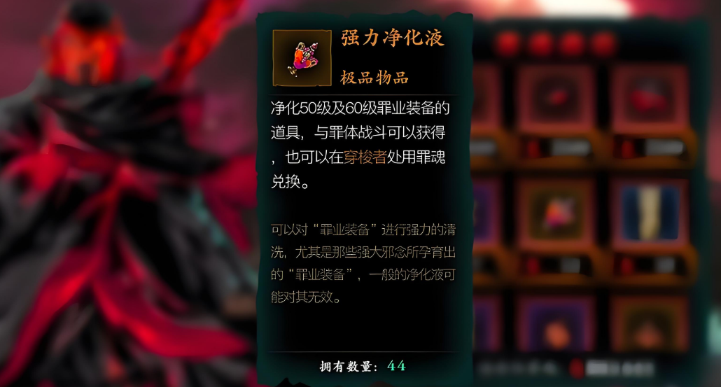 罪业装备刚拿到手时是不能直接使用的,必须先用净化剂清洗掉上面的罪业。净化剂这玩意儿只能在罪业空间里通关后,用获得的材料兑换。建议小伙伴们多攒点净化剂,因为每次净化都需要消耗,而且净化后的装备属性是随机的,可能要多洗几次才能出好属性。记得留点洗罪符,这东西能暂时压制装备的负面效果。