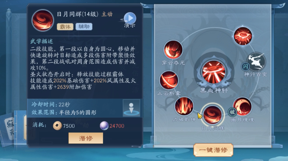 日月心法的核心机制围绕日月圣火状态展开,该状态可通过主动技能开启或关闭,消耗气血换取全方位能力提升。圣火状态下可抵挡一次致命攻击,并强化大部分技能效果。寂灭与通明两大流派分别侧重残血爆发和防御续航,需根据战斗场景灵活切换。心法加点需优先考虑圣火状态的增益效率,例如寂灭流需强化低血量时的伤害加成,通明流则需提升防御属性和生命恢复效果。
