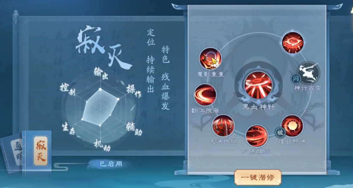 寂灭流派的技能组合以魔影重重和八荒俱灭为核心,前者提供快速起手与控制,后者实现大范围爆发输出。心法天赋中垂云汋步可减少魔影重重冷却时间,同时提升翻江搅海的吸血效果;山河诛灭则增强对玩家和宠物的伤害。需注意寂灭的被动效果会随气血降低提高伤害,因此战斗中需精准把控血量阈值,配合枯木逢春天赋的免死回血机制实现反杀。