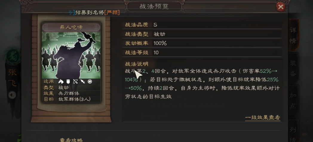 张飞最好带点能控场的,像落凤这种能让人闭嘴(计穷)的技能就挺好,配合他自带的咆哮扒防御效果更狠。输出型的比如刚勇无前也挺配他那种越挨打越来劲的暴脾气。庞统呢,太平道法几乎是他的命根子,有了它,连环计甩出去的机会才靠谱。另一个格子可以考虑无当飞军或者士别三日,前者能稳定给对面下毒(中毒)配合连环,后者能让他开场先苟住几回合,后面爆发更安全。兵书选择上,张飞走胜而益强配合胜战的路子能打能扛,庞统点出后发先至配上鬼谋或者将威能把他的技能伤害往上抬一截。