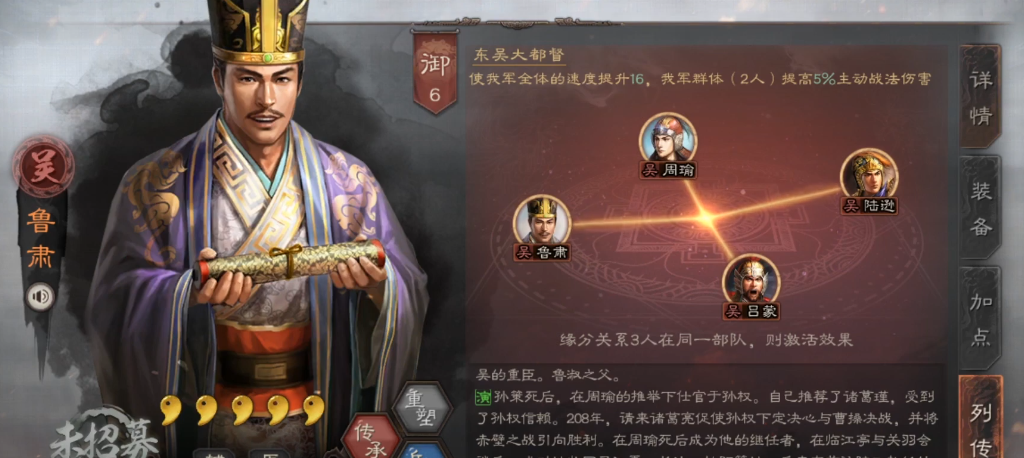 都督队以周瑜、陆逊为核心输出,搭配吕蒙或鲁肃组成经典法弓阵容,咱们玩这套阵容要抓住灼烧联动这个关键。周瑜自带神火计,发动主动战法后大概率触发群体谋略伤害并附加灼烧,你给他配上夺魂挟魄和刮骨疗毒最理想——夺魂能削弱对手智力属性,刮骨则保障续航,让周瑜在攻防两端都发挥作用。陆逊作为主力输出,战法命中灼烧目标会追加爆发伤害,因此风助火势和太平道法是首选,这样能最大化利用火系联动。吕蒙的白衣渡江首回合提供抵御护盾,后续通过兵刃/谋略伤害触发缴械或计穷,你给他加速度确保先手很关键,机略纵横这类多段谋略战法比天降火雨更能稳定触发控制。