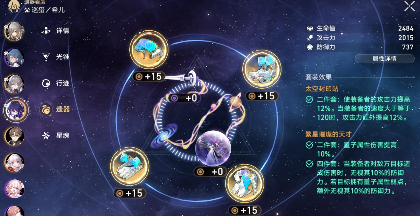 繁星璀璨的天才四件套是希儿最核心的遗器选择,该套装提供量子属性伤害提升,并赋予无视目标防御力的效果。当攻击目标具有量子弱点时,无视防御的效果会进一步增强,这显著提升了希儿对量子弱点敌人以及跨属性作战时的输出能力,是其作为量子属性主C的毕业外圈遗器。过渡阶段可使用繁星璀璨的天才、野穗伴行的快枪手与太空封印站进行二加二加二的散件组合,或直接使用野穗伴行的快枪手四件套作为替代。