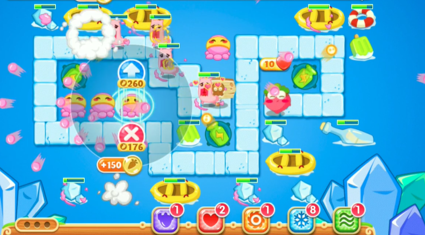 中期阶段的核心是集中火力处理救生圈清理任务,必须在时间限制内完成这个目标。在已经清理出的空位上增建2到3个瓶子炮塔专门针对救生圈进行攻击,同时逐步增加章鱼炮塔的数量并全部升级至顶级,确保火力覆盖范围能够应对不断增强的怪物波次。这个阶段特别需要注意快速移动的敌人,可以在关键路径的拐角处放置1到2个便便塔进行减速控制,为炮塔争取更多输出时间。当遇到怪物密集进攻时,要灵活调整炮塔位置,将火力集中在怪物行进路线的主要通道上。