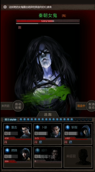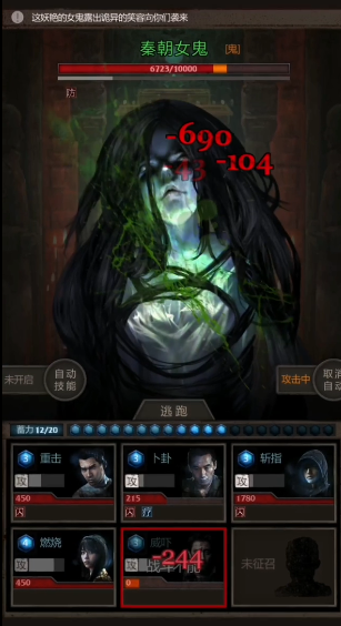 要是觉得攒豆一波流的时机太难把握,还有个备用的思路就是强行打断流。这个打法需要你的队伍里有特定的功能型角色,比如绑马头人或者胖子,他们的技能里带有能嘲讽或者封印敌人技能的效果。操作思路就是在你把女鬼血量磨到快触发回血的边缘时,不是停手等,而是瞅准时机,让这些角色放出嘲讽或者封印技能,直接把女鬼正在准备的回天大招给憋回去,让她放不出来。打断成功之后,你就有更充足的时间组织火力把她打掉了。但这个方法也有风险,一是嘲讽技能的回合数有限,不一定能持续到战斗结束,二是技能打断的成功率和角色自身的等级挂钩,如果等级不够可能会失败,一旦失败没封住让她把血回上来那就前功尽弃了。