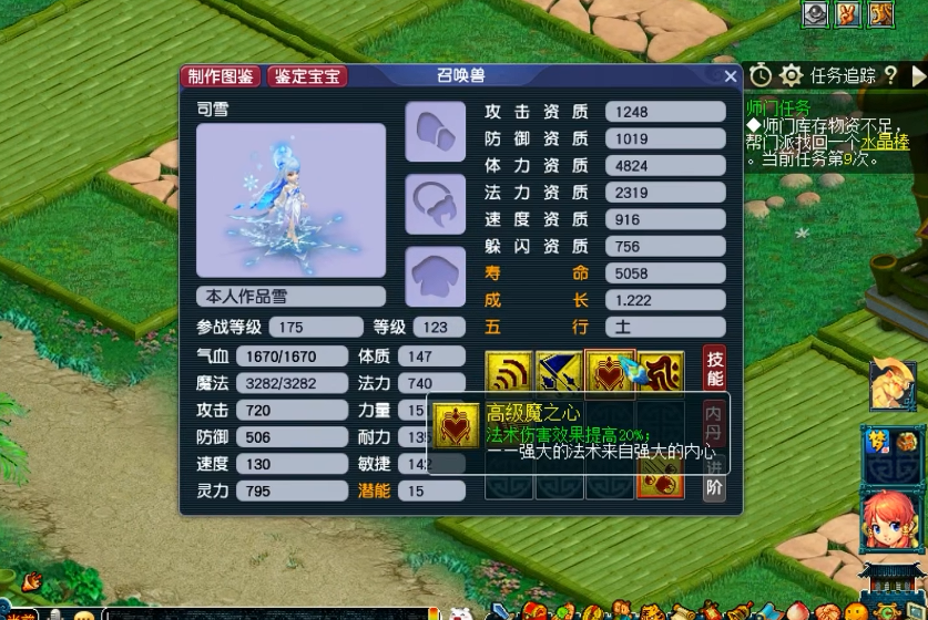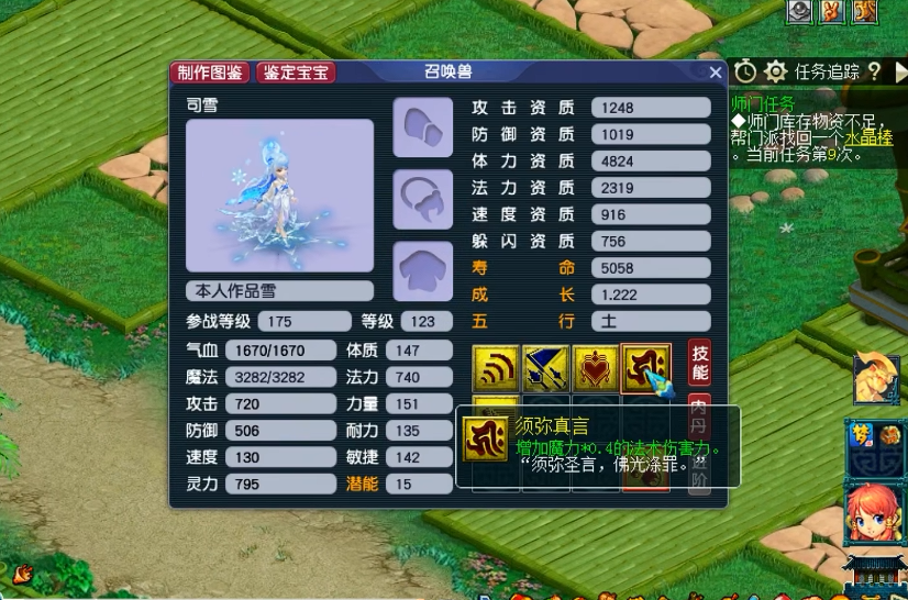 养成一只合格的任务须弥其实挺亲民。主技能锁定须弥真言和群法(比如泰山压顶),再配上魔之心、法术暴击这两件套,输出框架就成型了。内丹方面优先选灵光(加法伤)、灵身(加法暴效果),剩下格子补矫健或静岳撑点速度气血。资质上法资和速资最关键,成长反而影响不大,所以遇到高法资的胚子就算成长稍低也能用。