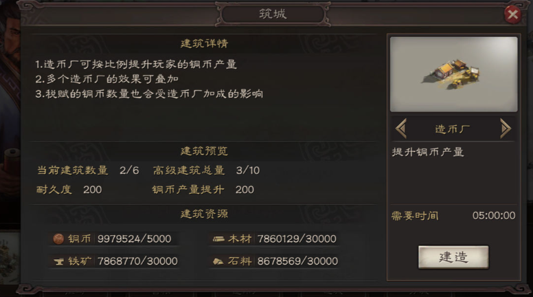 就是高级建筑的总数上限。游戏里所有建在资源地上的高级建筑,包括虎帐、造币厂、工坊、乐府等等,加起来总共只能建10个。这个名额是非常珍贵的。不少攻略会推荐6造币厂1工坊3虎帐这样的搭配,这正好用满了10个名额,也说明了虎帐在后期规划中的地位。你不能光想着建虎帐而忽略了经济建筑,否则铜币和资源产量跟不上,也会严重影响发展。在决定用地和数量时,心里一定要有一盘整体的账,做好长远规划,根据你当前是侧重发育还是即将进入高强度对抗阶段来灵活调整。