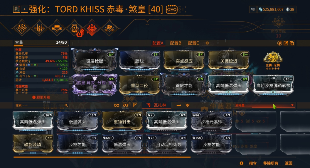 认识到极化与赋能的作用会让你对等级有全新的认识。当你感觉MOD容量即使满级也不够用时,就需要使用福马(Forma)对装备进行极化。极化会重置装备等级回0,但会提供一个与MOD极性匹配的槽位,大幅降低该MOD的容量消耗,让你能装备更多、更高级的MOD。一件经过多次极化、精心配置的武器或战甲,其威力足以应对远超其表面等级的任务。