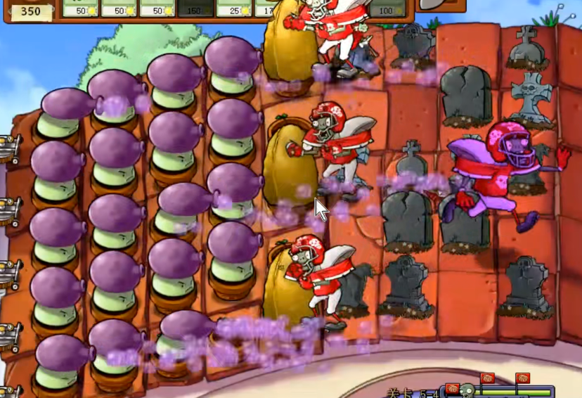 这一关的僵尸组合特别考验人,铁桶僵尸跑得飞快,橄榄球僵尸和梯子僵尸是两大主力麻烦。对付他们,硬碰硬可不行,得讲究策略。开局看到铁桶僵尸的路线,可以果断用倭瓜去坐一下,能争取不少时间。橄榄球僵尸冲锋起来很猛,倭瓜和土豆雷是拦截他们的好手,但要注意冷却时间,别一股脑全用了。梯子僵尸可以用樱桃炸弹集中清理,顺便还能炸掉附近的其他僵尸。记得墓碑一出现就要尽快处理,不然它们会源源不断地冒僵尸出来干扰你的布局。