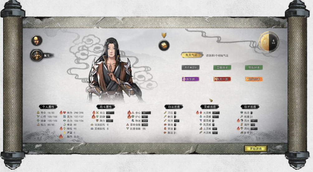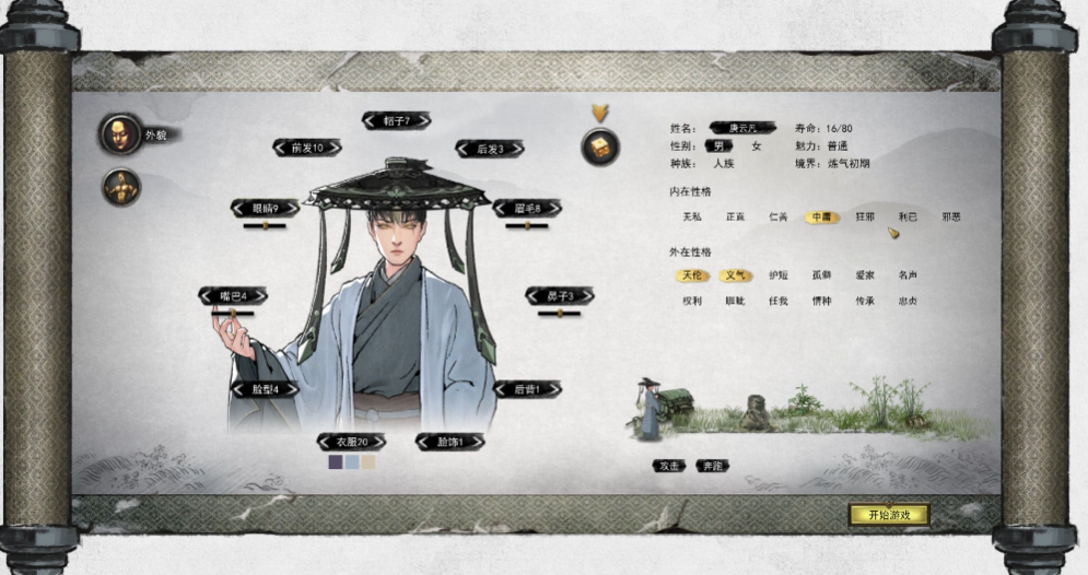 人物开局可以说是你整个修仙生涯的基石,这一步走好了后面会顺畅很多,第一步就是创建角色时的各种选择。进入游戏后你会面临难度、外貌、性格和气运这几个核心选项。对于刚接触游戏的新手来说,难度选择上不用太激进,普通或者困难模式是比较合适的起点,既能让你体会到修行路上的挑战,又不至于因为频繁失败而感到太强的挫败感。外貌捏脸系统不单单是为了好看,它还直接影响角色的魅力值,魅力高了以后和那些NPC打交道会顺利不少,当然如果你不太在意这个,随便捏一个自己能接受的样子也完全没问题。性格的选择需要稍微留心一下,这可不是个花架子,它会实实在在地影响游戏世界里其他人物对你的态度,比如你选了比较正面像无私、正直、义气这类性格,大家就更容易和你成为朋友,找你聊天送东西的机会也多,反过来要是选了些孤僻或者狂邪的性子,可能就会感觉路上冷冷清清,互动起来也容易话不投机。