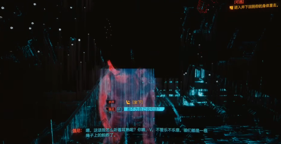 做出了想活下去的选择后,紧接着就会面对另一个至关重要的场景。你会发现面前有一条可以通向远方的桥,旁边也有一口可以回去的井。这里千万要你的目标是回到自己的身体,而不是探索网络的深处。你必须抵制住走过那座桥的诱惑,坚决选择从井里回到你自己的躯体中。这个操作是让V意识存续、以自己身份活下去的必经步骤,如果选错了,走向了桥的那一边,结局就会完全不同。