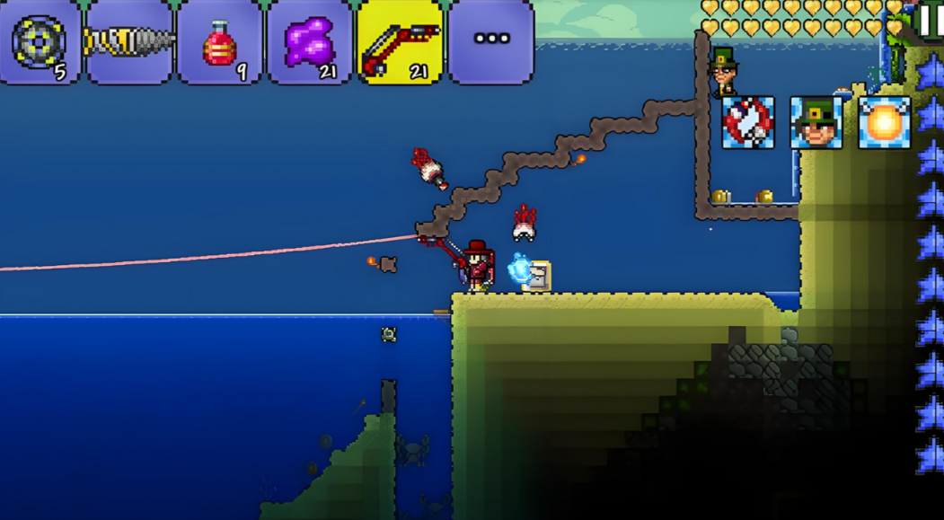 工欲善其事,必先利其器,想要高收益,合适的钓竿和鱼饵是少不了的。游戏里有好多不同级别的钓竿,从最初只有5点渔力的木钓竿,到中期可以合成的铁钓竿、邪恶矿石做的灵魂钓竿,再到后期通过完成渔夫任务才能拿到的最强的50点渔力的金钓竿。显然,金钓竿是追求最高收益的终极目标,但它需要你完成不少任务才能获得。鱼饵方面,除了用虫网抓到的蠕虫、蝴蝶,还可以用坠落之星和虫子合成更强力的附魔夜行者。松露虫则是召唤强力BOSS猪鲨的特殊鱼饵。鱼饵的品质也直接影响渔力高低,所以多用高品质鱼饵准没错。
