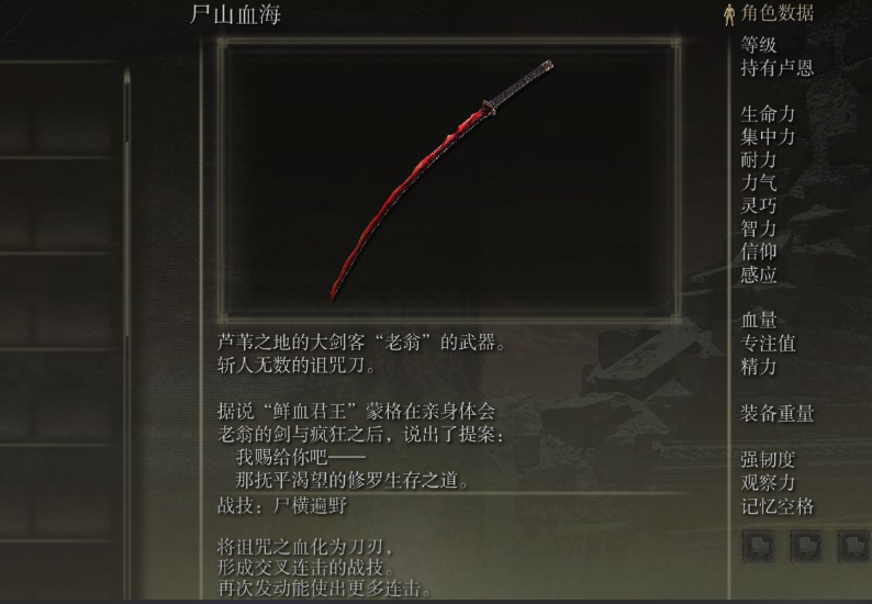 其毕业套装的核心在于平衡高机动性、输出与生存能力。毕业武器的首选是位于雪山区域安歇教堂的尸山血海(不死斩),击败入侵NPC血指老翁后即可获得,其战技秘传·不死斩能造成高频出血积累,配合仿生泪滴骨灰可形成极强的爆发输出。防具方面,追忆铠甲套装(老翁的高徒套装)是最优选择之一,需在大雪山的唤灵洞穴内获取,这套装备兼具中量级防御与契合武士风格的外观,非常适合力敏流派的负重需求。武士作为高灵巧职业,其装备搭配应服务于发挥其敏捷与出血特性的优势。