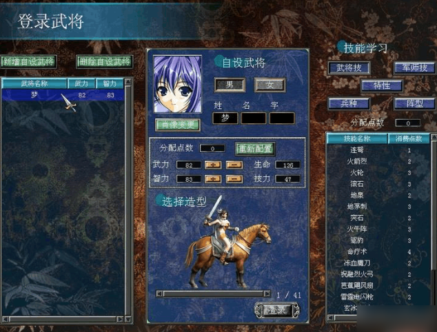 启动自设武将功能,需要在游戏开始界面选择登录武将并点击新增武将来启动创建流程,自设武将允许玩家创建个性化角色参与游戏,属性分配环节中武力与智力上限均为