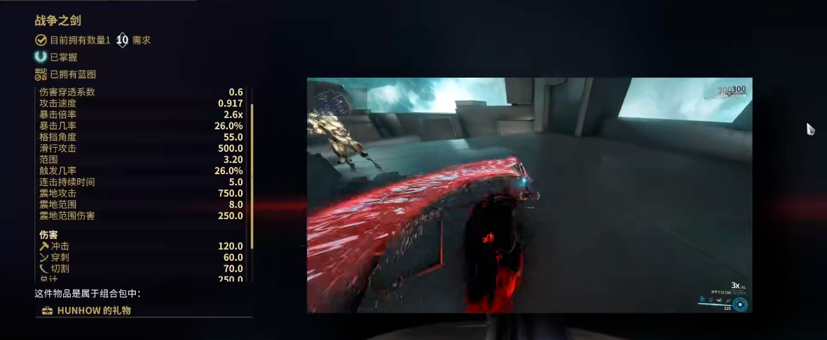 除了反复挑战ShadowStalker拼运气掉落蓝图之外,还有一个更直接但需要消耗资源的获取方式,那就是在游戏内的商城直接购买Hunhow的礼物组合包。这个组合包内含已经制作完成的完整战争之剑,无需你再收集蓝图和材料进行铸造,适合希望快速获得这把武器的玩家。