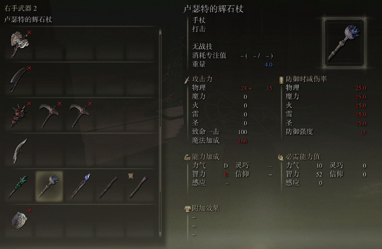 卢瑟特的辉石杖稳坐法师毕业武器头把交椅,智力加成高达408点,配合彗星法术与无限蓝露滴能瞬杀大部分BOSS,代价是蓝耗显著提升。卡利亚权杖满强化后373点魔法加成,中后期综合性能优异,尤其适合施展满月魔法。陨石杖虽无法强化,但开局即可拾取且自带S级智力补正与重力魔法强化,是性价比最高的开荒神器。死王子杖凭借智信双补正特性,在水桶号养成后期潜力最大,但需大量点数支持且入手较晚。