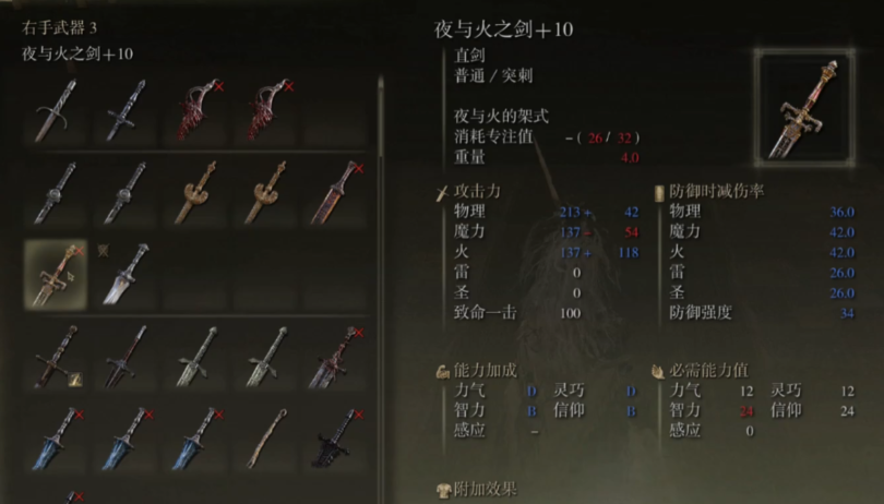 近战法师首选夜与火之剑,双战技设计兼具火焰横扫与迷你彗星光炮,智信双修适配性强。名刀月隐凭借出血效果与高削韧战技居合斩,对人形怪压制力极强,需18力17敏12智。暗月大剑战技附带冰冻,破防后处决效率突出。这三者形成法术削弱-近战终结的作战循环,护符建议搭配魔法师球护符增伤与卡利亚徽章降耗。