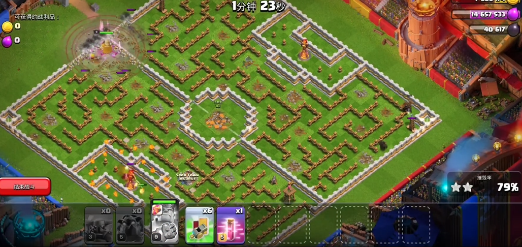 流派搭配与法术携带可以大幅提升出兵胜率,主流选用天女狗球成型体系,天女提前清理外围防御、击杀女王英雄、引出敌方部落援军,扫清空军推进阻碍,法术优先携带狂暴与急速药水,狂暴给到防御密集区域提升气球爆发伤害,急速药水弥补气球移速短板,帮助部队快速聚拢推进,遇到地狱塔、多层重火力时补上冰冻法术控场,援军选择气球或者天狗补位,再搭配少量亡灵兵种收尾清边,解决防御打完遗漏建筑的问题,全方位提升三星成功率。