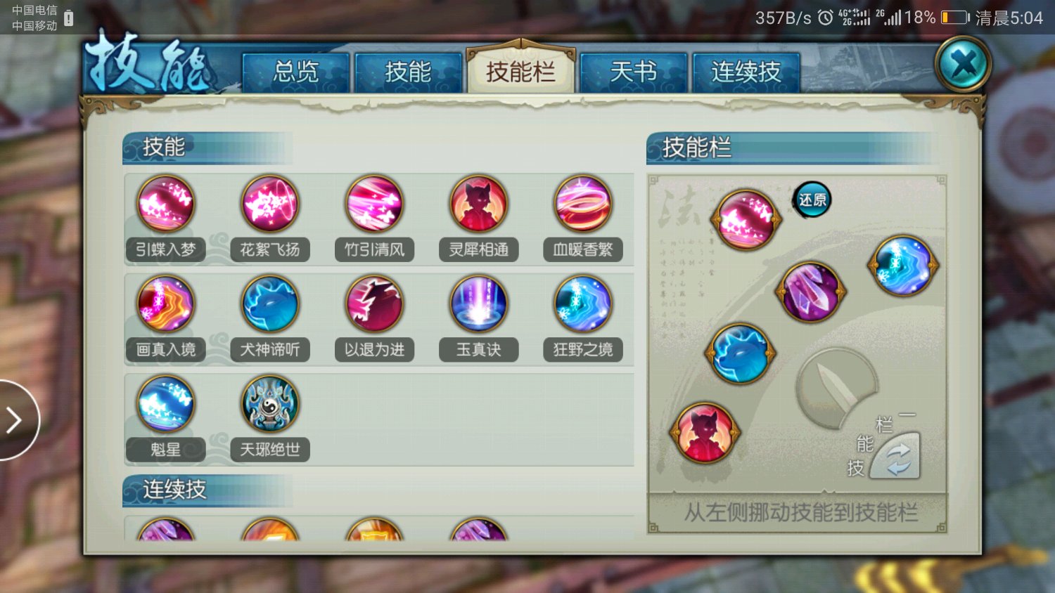 竹引清风和花絮飞扬虽然看起来不错,但在单挑时作用不大,建议直接舍弃。以退为进必须留在技能栏里,它的解控和隐身效果能帮你拉开距离重新组织攻势。狂野之境是个容易被忽略的宝藏技能,给本体和召唤兽加伤害的同时还能提速,配合灵犀相通能让输出质变。别忘了把天琊和灵犀相通设置成连续技,这样能省下操作空间,关键时刻一键爆发。