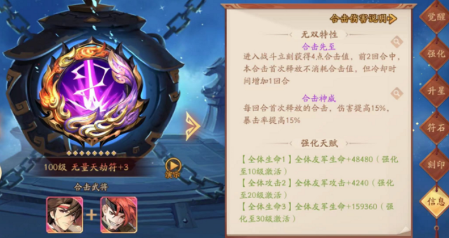 兵符的强化与升星是提升战力的重要途径。升星依赖同名兵符碎片,每提升一星可显著增强基础属性与技能效果;强化则需消耗兵符精华,每10级激活的强化天赋往往带来质变。材料获取主要通过列传战役、限时活动及商店兑换,需合理规划资源分配。高阶兵符如无量天劫符或乱舞春秋符具备扭转战局的能力,但需通过特定活动积累碎片,建议优先培养主力阵容的核心兵符,避免资源分散。