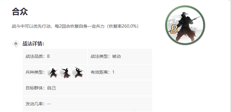 合众属于被动型战法,战斗中能让你优先行动,并且每2回合自动恢复一定兵力,恢复率还挺高的,特别适合需要续航的阵容。这个战法不是直接抽卡就能拿到的,而是需要通过研究或者特定活动获取,所以得多留意游戏里的相关玩法。