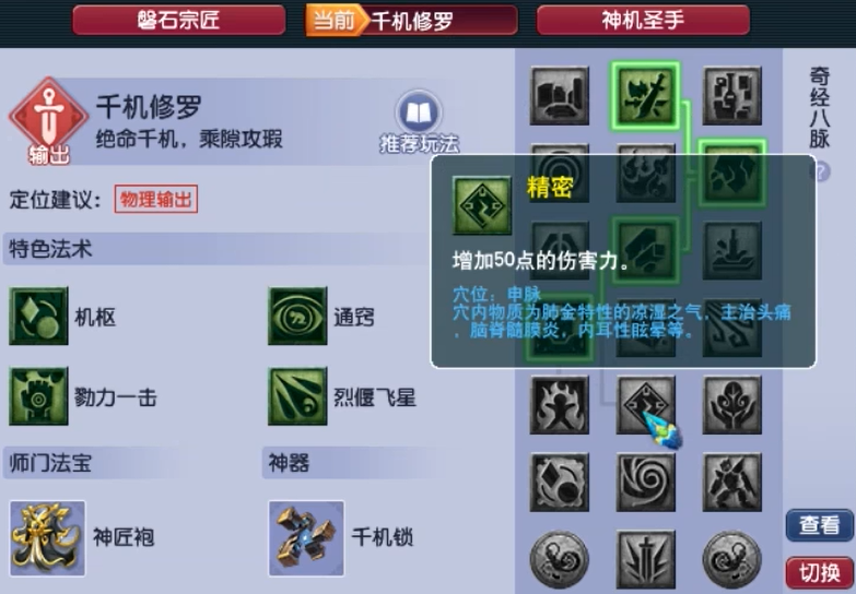 千机修罗流派经过调整后,破锋经脉不再要求气血尾数,进入战斗即变身为三攻之械构筑的偃甲。低等级玩家可搭配神匠袍提升匠心蓄锐的恢复能力,高等级玩家则利用不厌的愤怒恢复效果,频繁使用破血狂攻进行点杀。第五层偃威经脉可增强清场能力,配合烈偃飞星实现面伤输出。PK中可通过杀机经脉强化勠力一击清宠效率,后期利用所向披靡收割残局。
