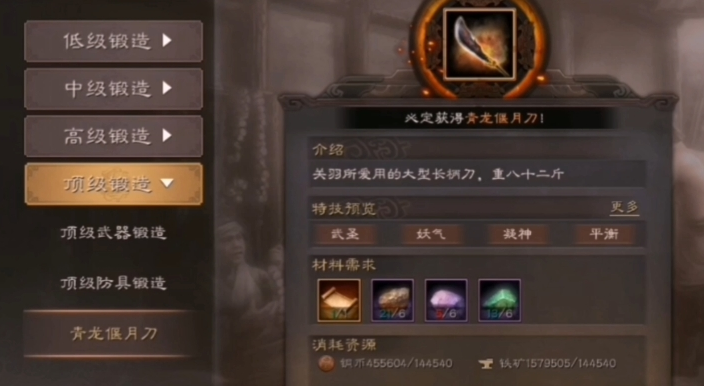 该武器的获取需通过锻造系统实现,图纸需从寻访、讨伐贼寇等活动中收集,锻造材料以高品质铁矿与秘钥为主。鉴于其专属性,建议优先为关羽锻造并升级,低品质词条仍可发挥核心特技价值,而极品词条如叠加蛮力(增伤)或凝神(命中)可进一步放大关羽优势。需注意锻造资源的分配优先级,若缺乏图纸,珍·锻冶材料宝箱可作为替代但存在随机风险。武器品质差异主要影响附加词条的属性浮动范围,对特技效果无直接影响。
