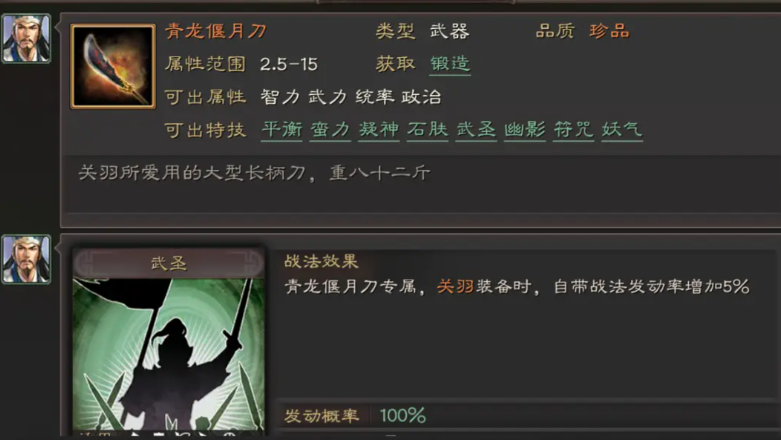 其核心价值在于显著提升关羽的战场统治力。该武器提供基础武力与统率属性加成,增强关羽的攻防能力,同时附带锐不可当特效,进一步强化其对敌军的压制效果。作为专属武器,青龙偃月刀的核心机制围绕其特技武圣展开,该特技可直接提高关羽自带战法威震华夏的发动概率,有效弥补该战法原始发动率较低的缺陷,从而优化关羽的输出节奏与控制稳定性。这一特性使青龙偃月刀成为关羽体系阵容中的战略核心装备,直接影响队伍的整体强度。
