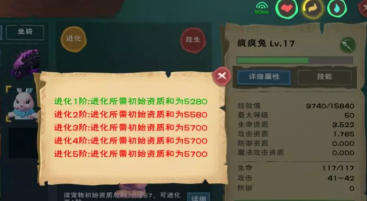 搞明白疯疯兔进阶二阶的资质要求可是关键一步哦!你得让疯疯兔的初始资质总和达到5580才行。这个数值是生命资质和攻击资质去掉小数点后相加的结果,比如生命资质如果是三点七,攻击资质是一点八,加起来就是五千五左右。如果总和卡在五千二到五千五之间,只能升一阶;只有冲到五千五才能稳稳解锁二阶。所以进阶前一定要先看看你家兔子的面板数据,算清楚够不够格,免得白费功夫。