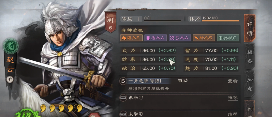 赵云凭借被动战法一身是胆获得全程洞察免疫控制效果,同时提升武力、统率、智力、速度四维属性,主将时加成更为显著。这一特性奠定了其攻守兼备的核心定位,使其成为兼具稳定输出与战术适配性的全能武将。配将需围绕其免疫控制的优势展开,优先选择需准备的主动战法避免被打断,同时利用高额属性加成强化其输出或承伤能力。骑兵与枪兵的双S适性为其提供灵活兵种选择空间,尤其在枪兵阵容中能发挥克制骑兵的战术价值。